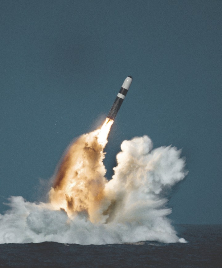 A Trident II missiles fires its first stage SRB after an underwater launch from a Royal Navy Vanguard Class ballistic missile submarine.